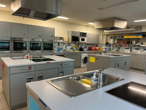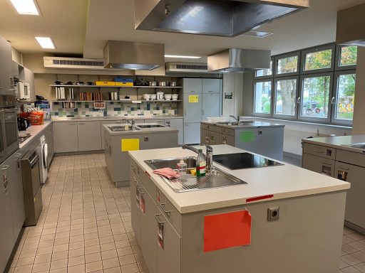 In der Lehrküche lernen die Schüler*innen in der 7. Klasse an insgesamt vier Kochinseln gesunde und leckere Mahlzeiten zuzubereiten. Was dazu gehört?